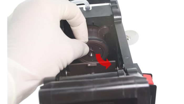 Die weiße Arretierung wird im Uhrzeigersinn gedreht, auch diese muss auf das geöffnete-Schloss-Symbol zeigen.